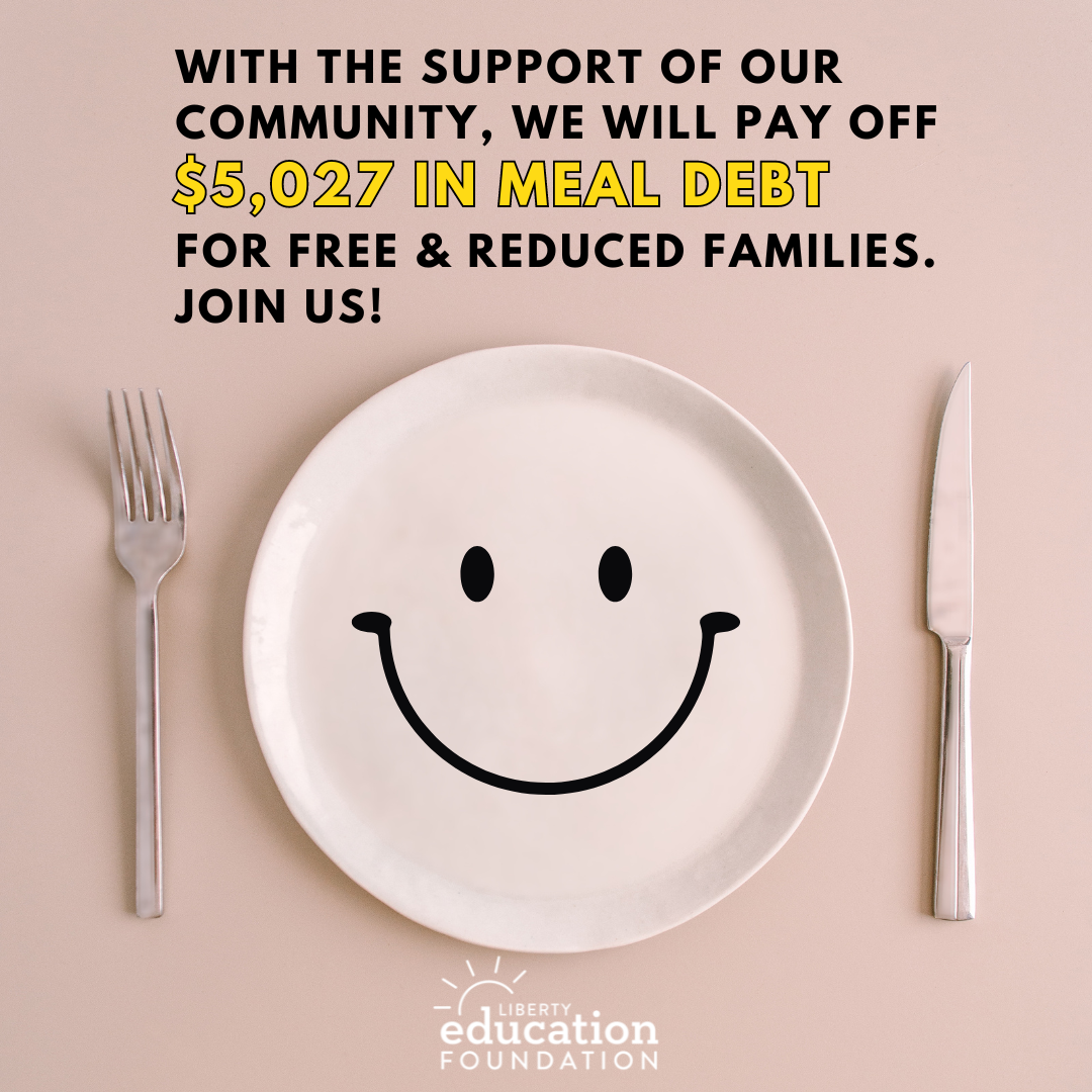 We are committed to paying off meal debt for families who qualify for free and reduced meals through our Liberty Cares Fund. The outstanding balance this semester is $5,027. To support this initiative, donate online at https://libertyeducationfoundation.org/libertycares. Every gift helps!